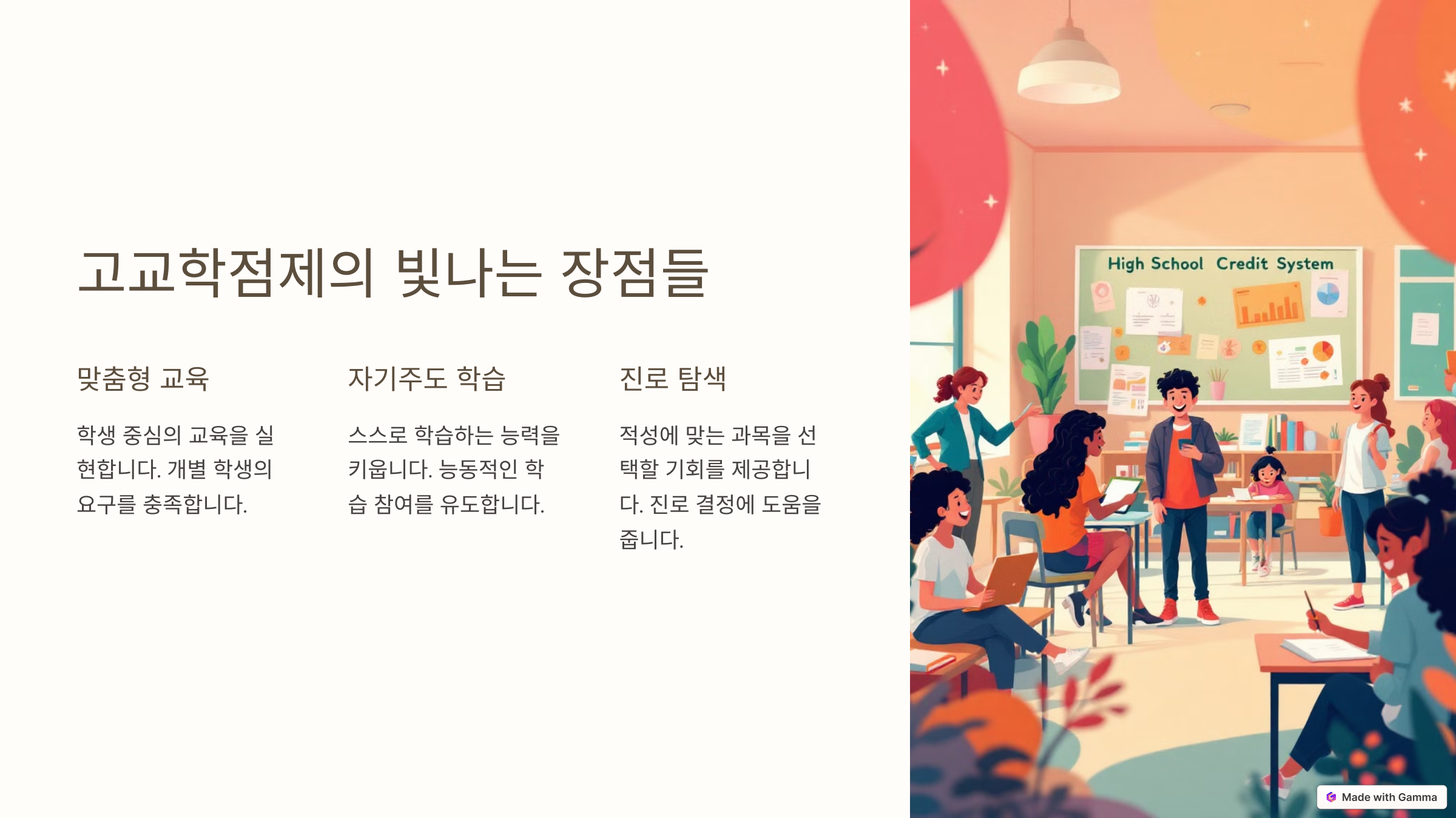 고교학점제는 학생들에게 맞춤형 교육을 제공하고, 자율성과 책임감을 키우는 데 중점을 두고 있습니다. 이러한 변화는 학생들이 미래 사회에서 필요한 역량을 갖출 수 있도록 돕는 중요한 단계가 될 것입니다.