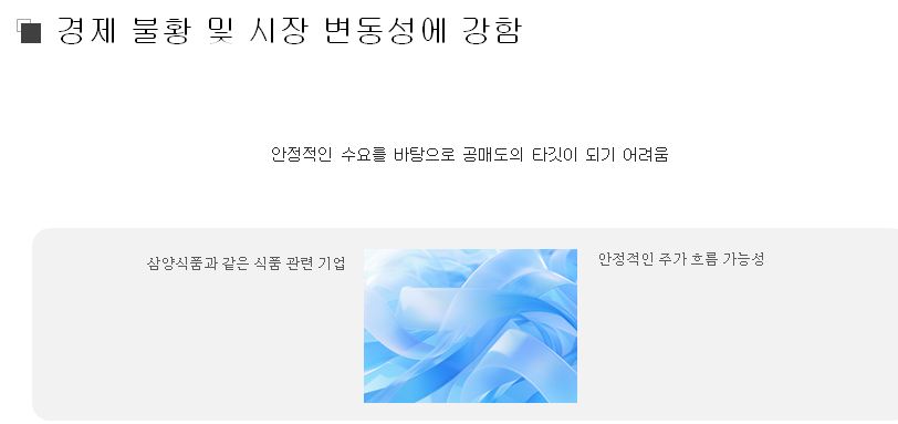 방어주는 경제 불황이나 시장 변동성이 클 때에도 상대적으로 안정적인 수익을 유지하는 기업을 의미합니다. 예를 들어, 삼양식품과 같은 식품 관련 기업은 안정적인 수요를 바탕으로 공매도의 타깃이 되기 어려운 특성을 가지고 있습니다. 이러한 방어주는 공매도 재개 이후에도 안정적인 주가 흐름을 보일 가능성이 높습니다.