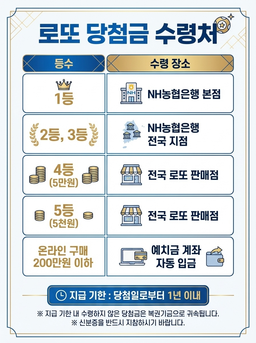 NH농협은행 본점에서 수령합니다. 200만원 초과 당첨금은 소득세법에 따라 세금이 원천징수됩니다.