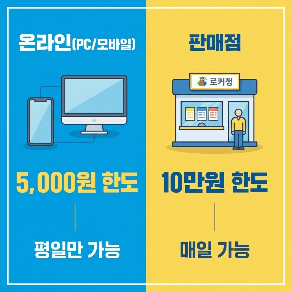 판매점에서는 1인 1회 최대 10만 원까지 구매 가능하지만, 온라인은 과몰입 방지를 위해 소액으로 제한됩니다.