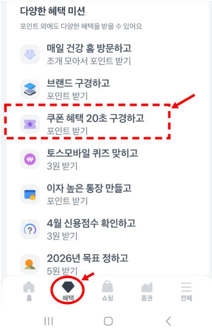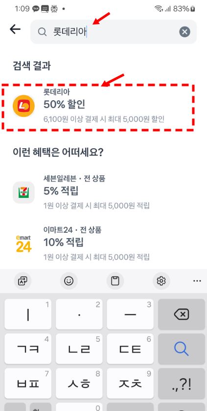 토스 앱 실행 → 하단 '혜택' 탭 → 상단 검색창에 '롯데리아' 입력