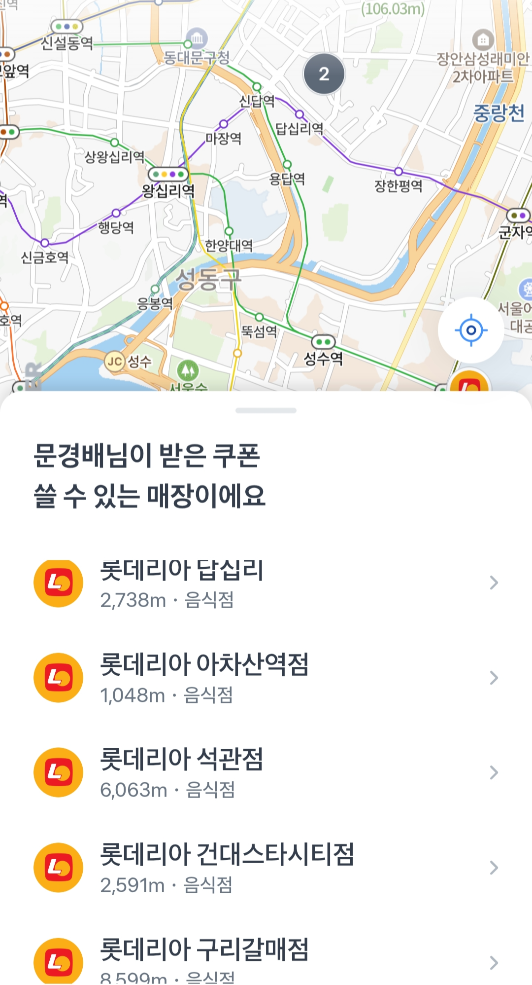 검색 결과에서 '롯데리아 50% 할인'을 누르면 상세 페이지로 이동합니다. 여기서 아래로 스크롤하면 '이벤트 매장' 지도가 나와요.