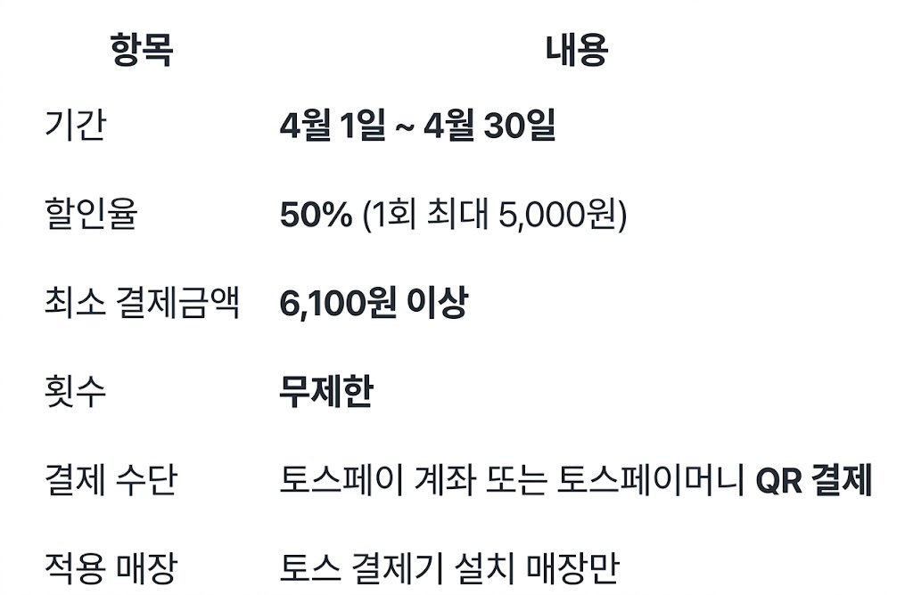 6,100원 이상 토스페이 QR 결제 시 50%, 최대 5,000원, 무제한. 롯데리아와 완전히 같은 조건입니다. 커피 한 잔 반값에 마실 수 있어요.