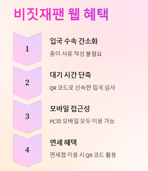 - 입국 수속 간소화: 비짓 재팬 웹을 사용하면 종이 입국 신고서와 세관 신고서를 작성할 필요 없이, 미리 온라인으로 정보를 입력하고 QR 코드를 발급받을 수 있습니다. 이를 통해 공항에서의 대기 시간을 크게 줄일 수 있습니다.