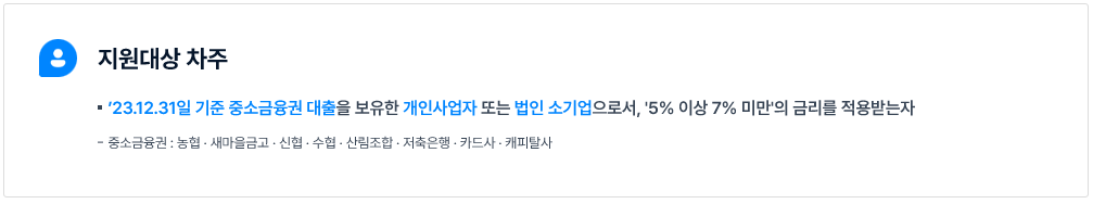 - 대상 조건: 2023년 12월 31일 기준, 중소금융권에서 5% 이상 7% 미만 금리로 사업자 대출을 받은 개인사업자 또는 법인 소기업.