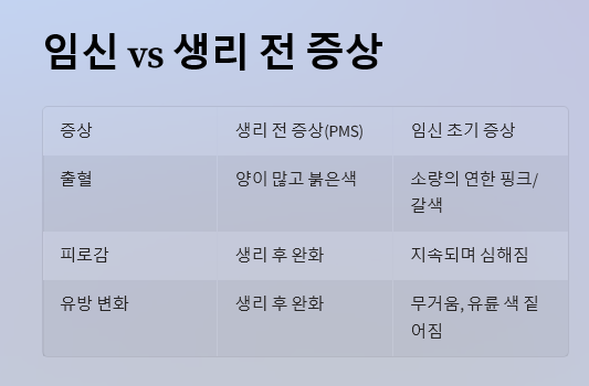 | 유방 변화 | 민감하지만 생리 시작 후 완화 | 유방이 더 무겁고 유륜 색이 짙어짐 |