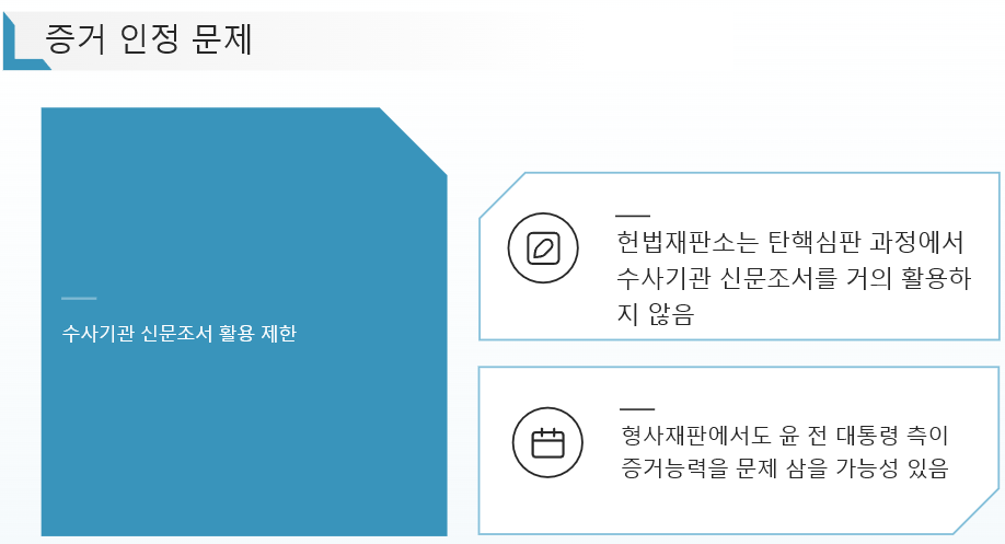 - 증거 인정 문제: 헌법재판소는 탄핵심판 과정에서 수사기관 신문조서를 거의 활용하지 않았으며, 이는 형사재판에서도 윤 전 대통령 측이 증거능력을 문제 삼을 가능성을 시사합니다.