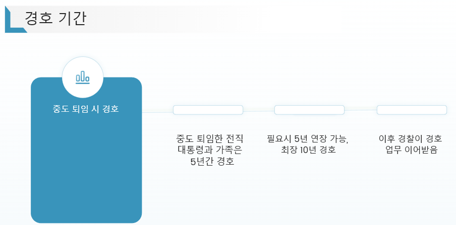 - 경호 기간: 중도 퇴임(탄핵 포함)한 전직 대통령과 그 가족은 대통령경호처로부터 기본적으로 5년간 경호를 받을 수 있으며, 필요시 5년 연장하여 최장 10년까지 경호가 가능합니다. 이후에는 경찰이 경호 업무를 이어받습니다.
