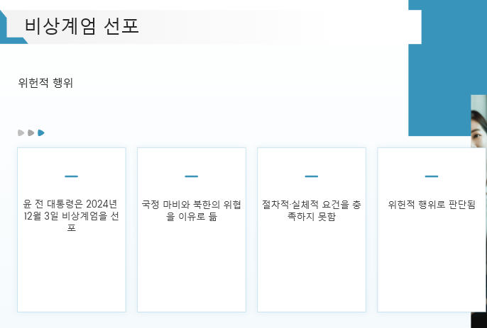 - 비상계엄 선포: 윤 전 대통령은 2024년 12월 3일 국정 마비와 북한의 위협을 이유로 비상계엄을 선포했으나, 이는 절차적·실체적 요건을 충족하지 못한 위헌적 행위로 판단되었습니다.
