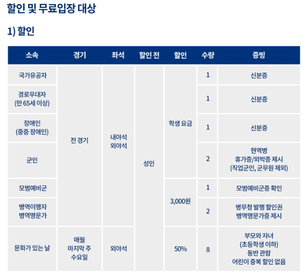 • 내야석 (1층/2층): 주중 및 주말 번들티켓 제공 (구매금액의 3%)