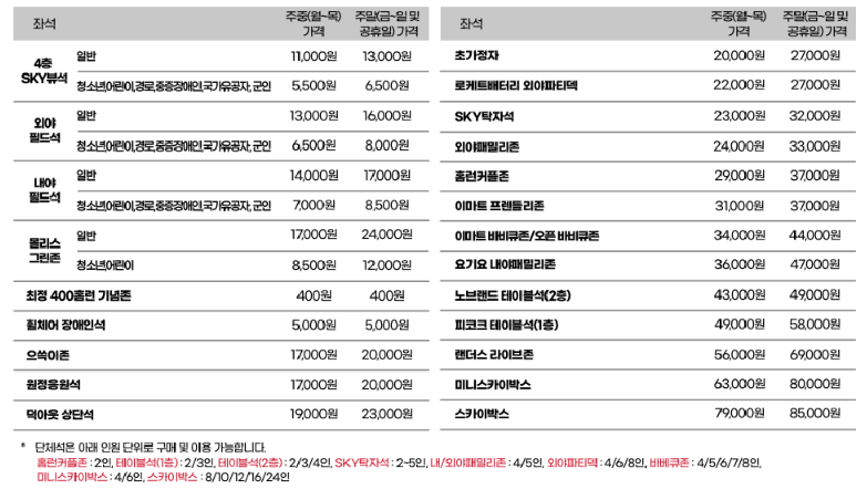 - 예: SKY뷰석 주중 6,600원, 주말 7,800원.