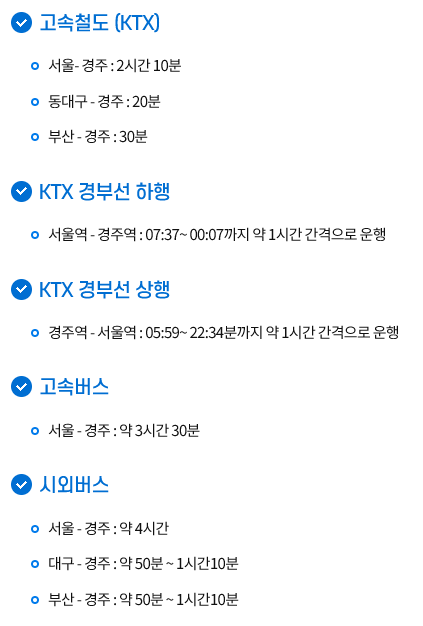 - KTX: 서울역에서 신경주역까지 약 2시간 소요. 이후 버스나 택시로 이동.